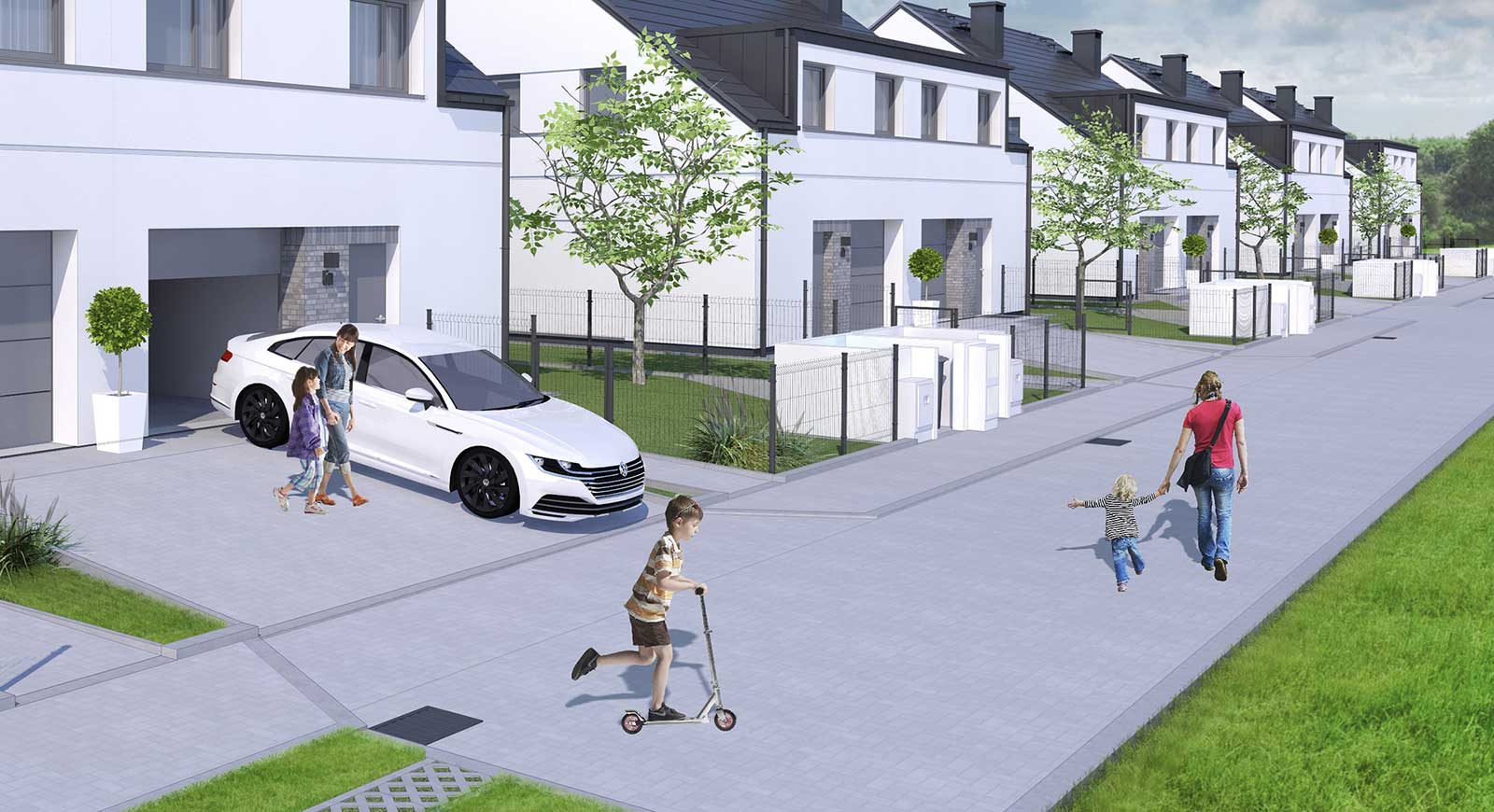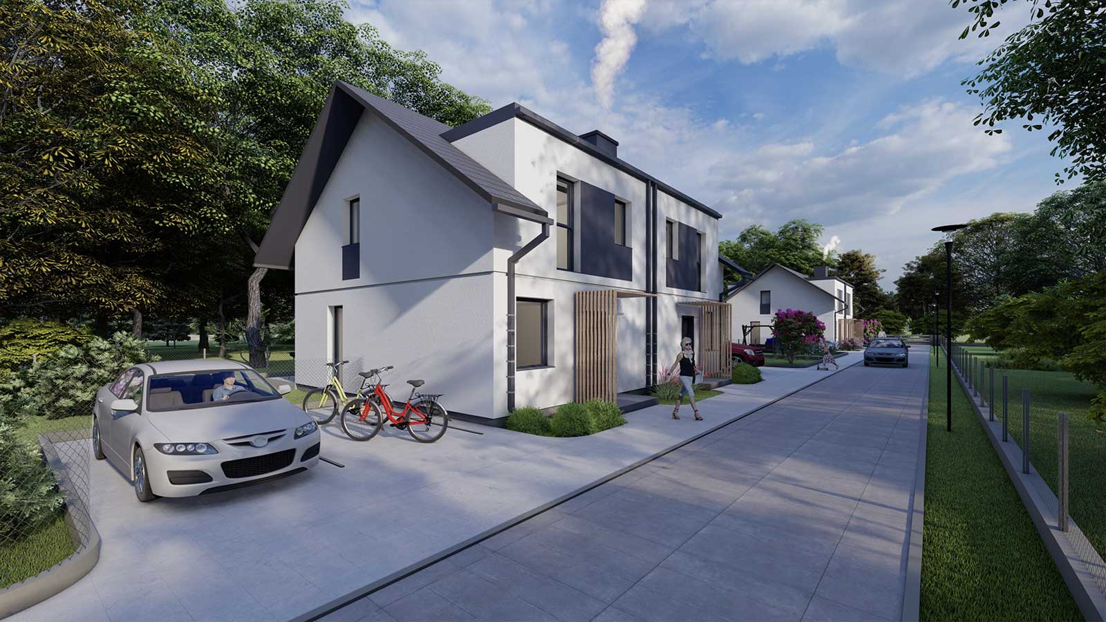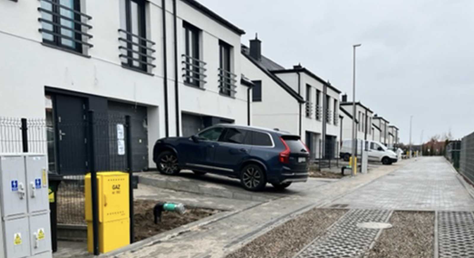 Do każdego domu prowadzi utwardzona droga dojazdowa, zapewniająca wygodny i bezpieczny dostęp niezależnie od pogody.